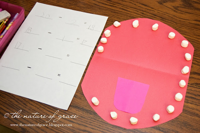 Losing baby teeth is part of growing up, so we made a mouth full of twenty baby teeth and then made up stories about losing teeth and number sentences to show how many teeth were lost and how many teeth were left. :) I believe I saw this idea on a first grade website as well but cannot remember where (if you know or see it, please feel free to send me the link so I can post it here).