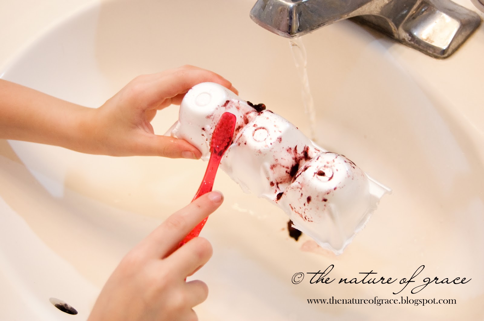 Another activity (see site here) used egg cartons for teeth. I chose to smear different kinds of real food on AND in between the "teeth", and Miss A would practice brushing them in the bathroom until she was able to get them sparkly clean again. She loved this!