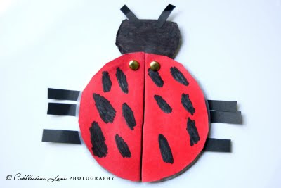 10. Cut a cardboard strip (or use a small piece of elastic if you have it) and staple/glue it to the underside of the ladybug for a handle.
