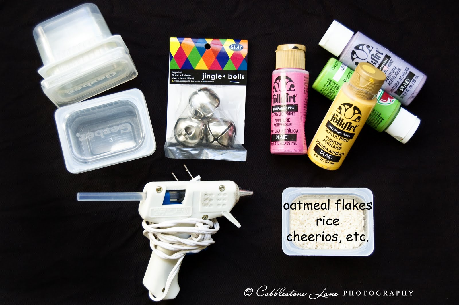 **safe items to put inside the "blocks". This is VERY important. For safety's sake, just assume your infant will one day figure out how to pry open a lid, so you want to make sure that whatever is inside the block will not be a problem if the child does. (Examples: just a few grains of rice - if your child managed to open a block and swallow too many, it could be dangerous so only use a very small amount, little bit of dry oatmeal flakes - again use only a very small amount, broken cheerios, large jingle bells. I used VERY large jingle bells that would be hard for my baby to swallow (although not impossible for him to get stuck in his mouth) if he ever did manage to open the block. HOWEVER, keep in mind that if the small ball in the jingle bell falls out, that could be a serious hazard. You may want to further safety proof them by placing the bells in a small mesh bag first and then placing the bag inside the block OR just skip the bells altogether.