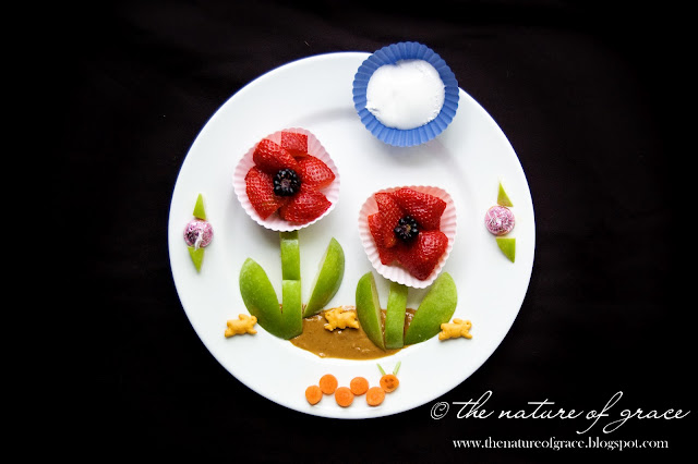 Garnishes: peanut butter soil with organic cheddar bunnies. Hershey hugs flower buds with green apple leaves and a carrot caterpillar (details on face drawn with food safe markers - see link below).
