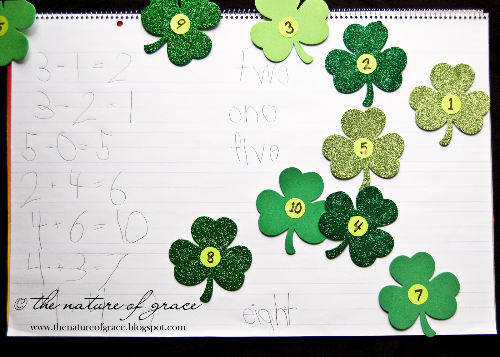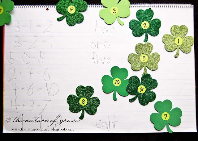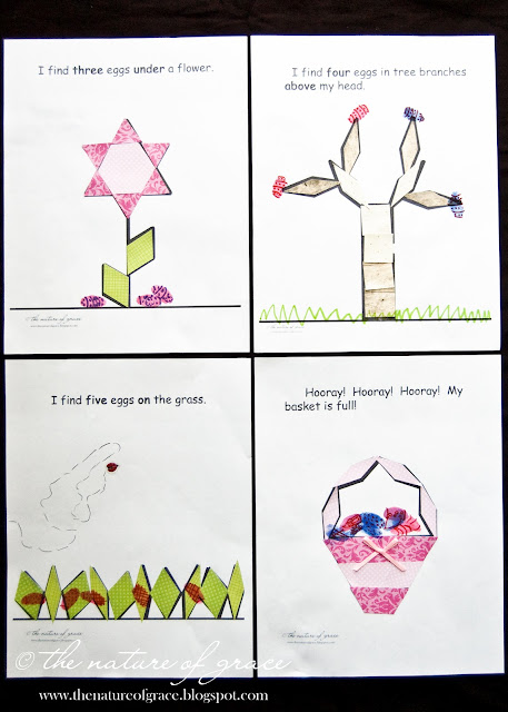 In our family, we have our egg hunt on the first day of spring. So this week seemed the perfect time to follow that fun activity up with a pattern block book for spring which also focused on number order, number words, and position words! :) I made our own pattern block pieces from different craft papers and then we added some fun details (I think the pom pom bunny tail was one of my favorites).