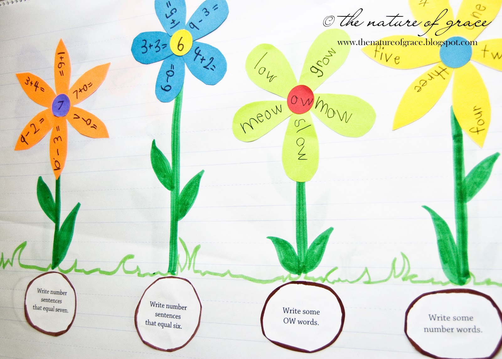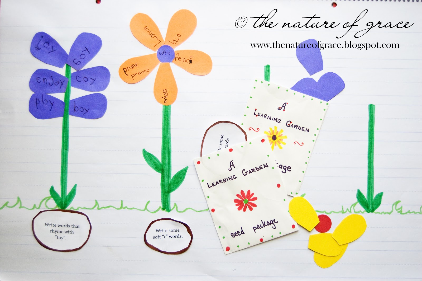 I made two seed packet envelopes and would place a "seed" in each with a description of what Miss A should be doing for a particular plant or flower written on the seed. The packets also contained the petals and items she would need for the flower. Then it was just a matter of following the directions on the seed (glue the seed to the base of the plant) and building one or two flowers for the day (we only made one or two per day)! :)