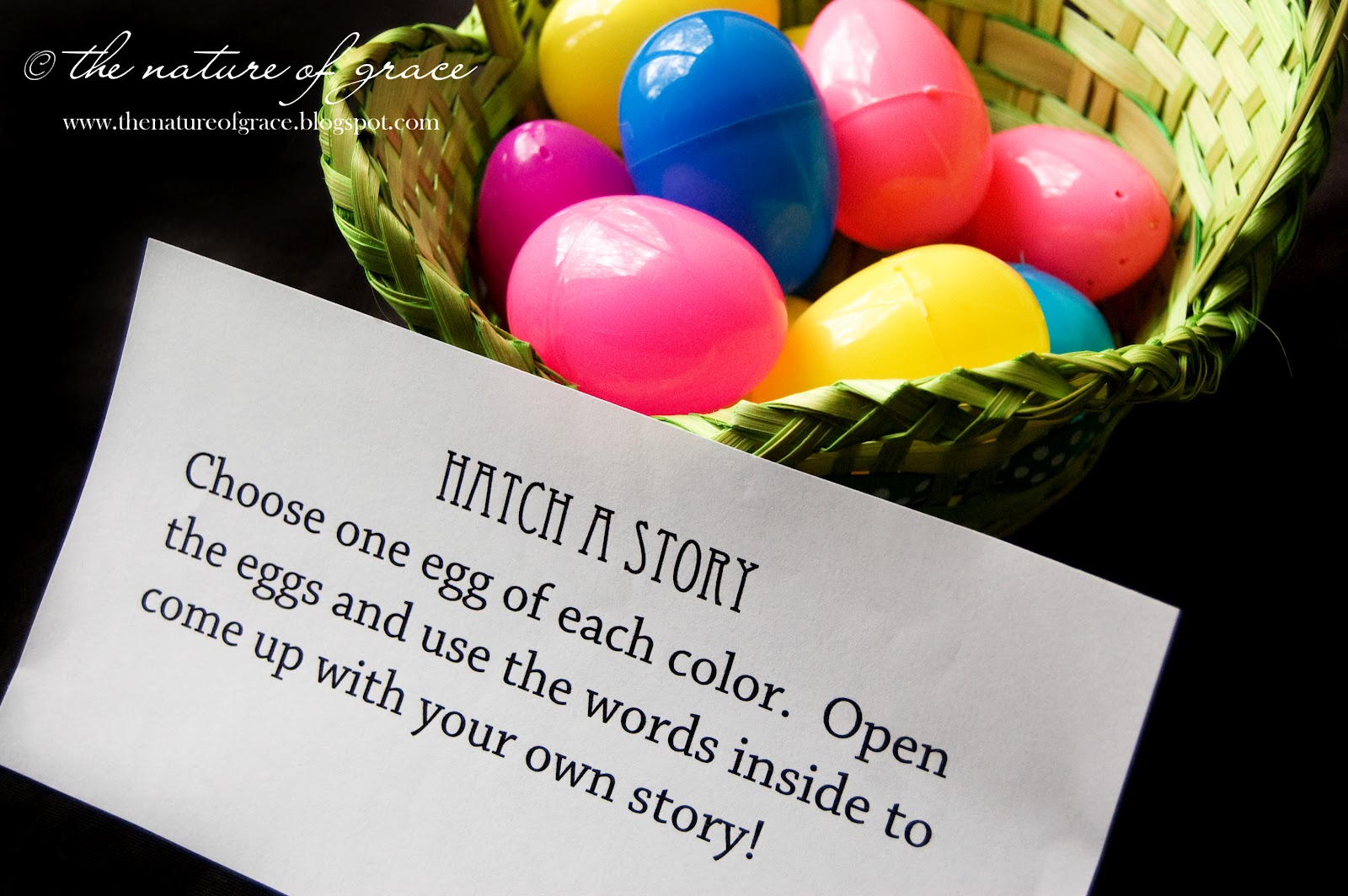 Hatch a story - really easy and fun! Want to hatch your own stories? Simply fill each egg with a word (you can also do this labeling certain colors as nouns, others as verbs, adjectives, etc.) and have your children pick one of each color. They open the eggs and try to come up with (and write down) a story using all of the words. For really tiny children, just have them tell you a story or sentence using the words. :)