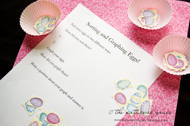 While in a craft store one day, my daughter found a sheet of craft paper covered with many different Easter egg prints. I purchased the paper, cut some of the eggs out and made up some sorting and graphing activities to go along with the eggs. :)