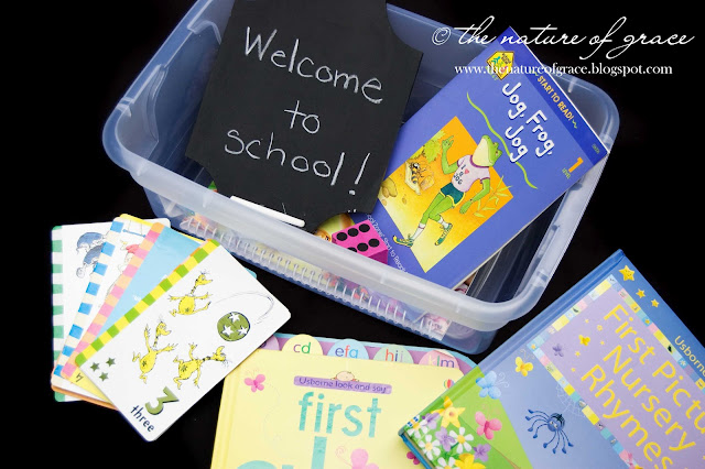 Here's our "pretend play" bin. I filled it with items for the kids to use when playing "mom and dad". It contained items such as baby dolls, books, baby doll clothes, a real changing pad, empty honey jar I filled with cornstarch (for baby powder - figured that was more easily vacuumed than creme), real diaper, cooking utensils, etc.