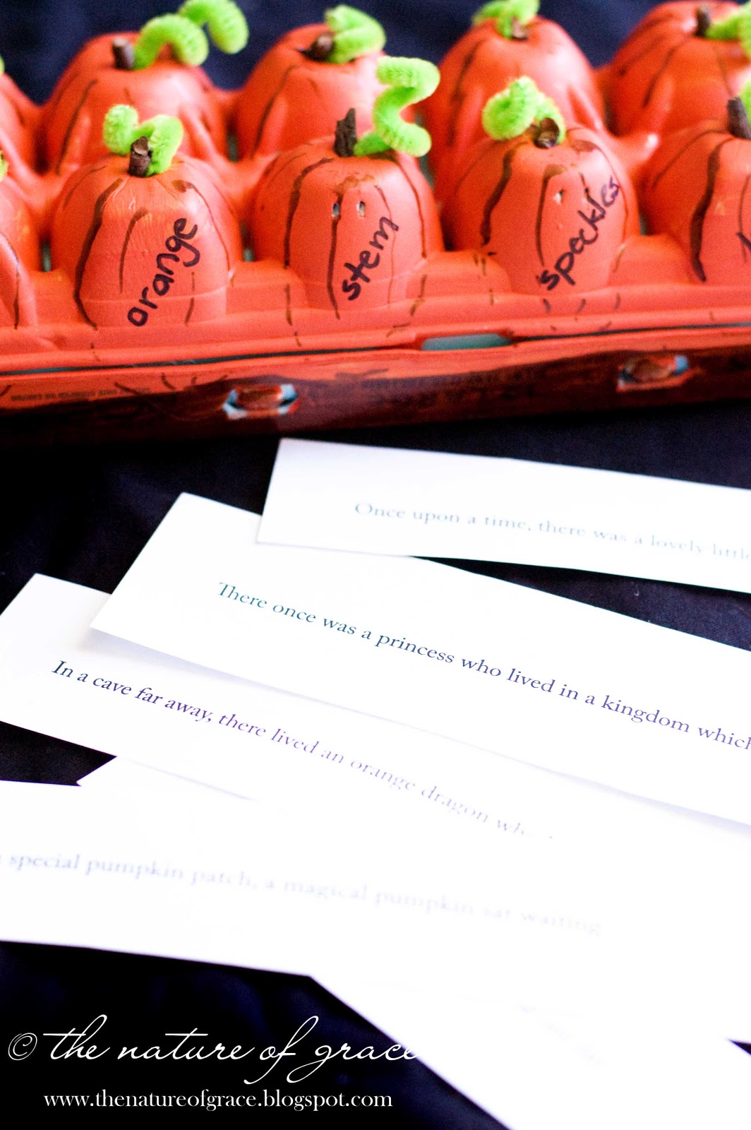 I also wrote some story prompts (each pumpkin related) and placed them inside the carton. On certain days, Miss A would choose one and complete a story to go along with it.
