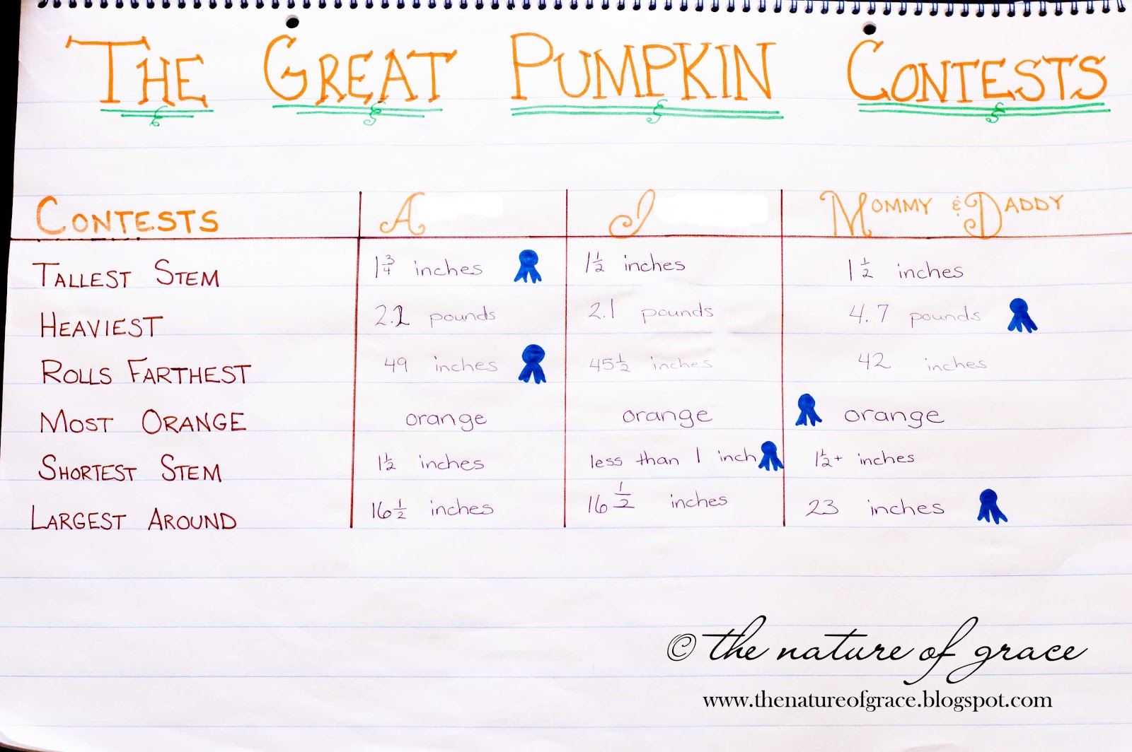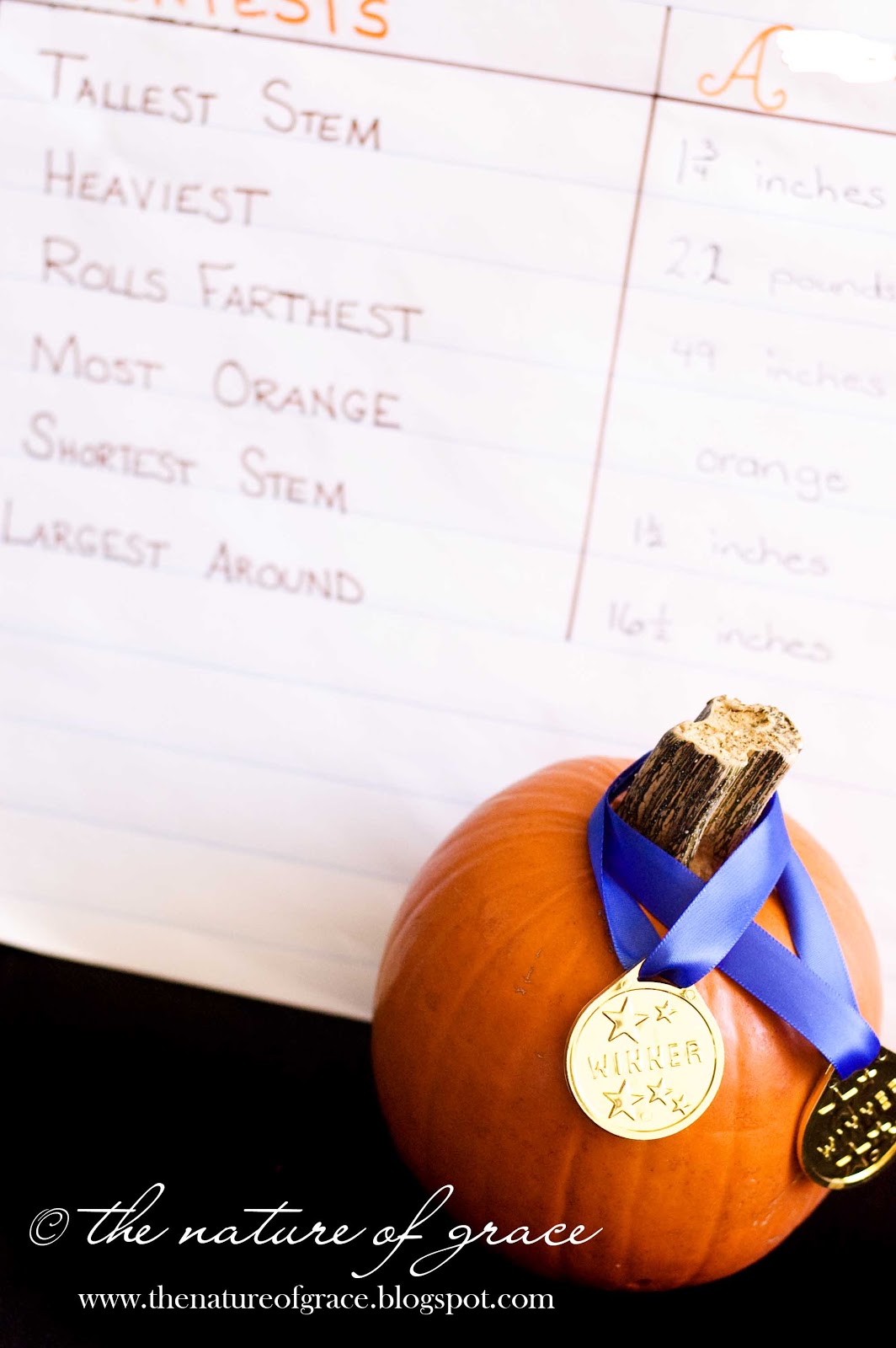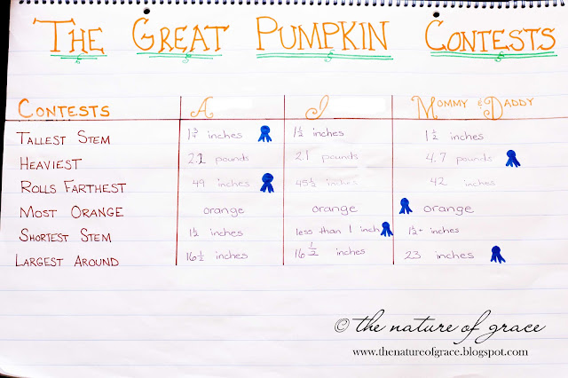 The contests were great for educational purposes - measurement, weighing, etc. The results were recorded and the winning pumpkins were each awarded a gold medal/blue ribbon (found a package of winner medals at Walmart in the party section for about $1, and I just switched out the ribbons for blue ones) for each category won!