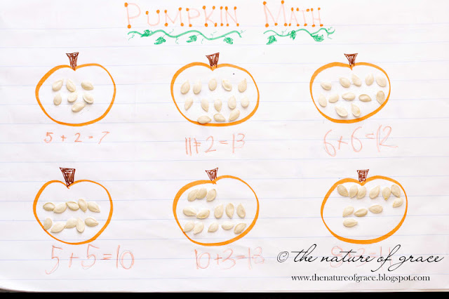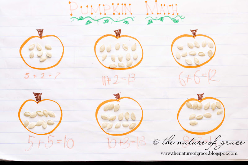 More pumpkin math! Miss A came up with number sentences to equal the number of real pumpkin seeds found in each pumpkin.