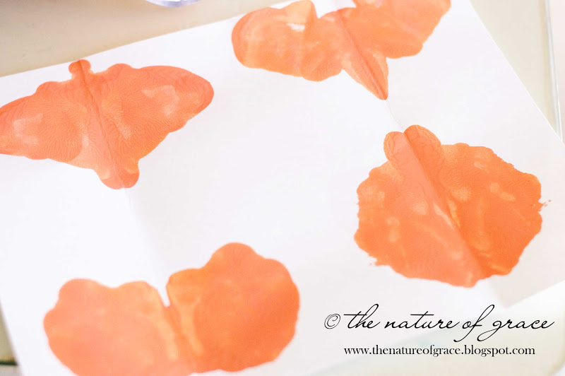 After the orange part dried, we added black paint to one side (for an eye, part of a mouth and nose), closed it again, and opened it to find a CrAzY looking jack-o-lantern face each time! :)