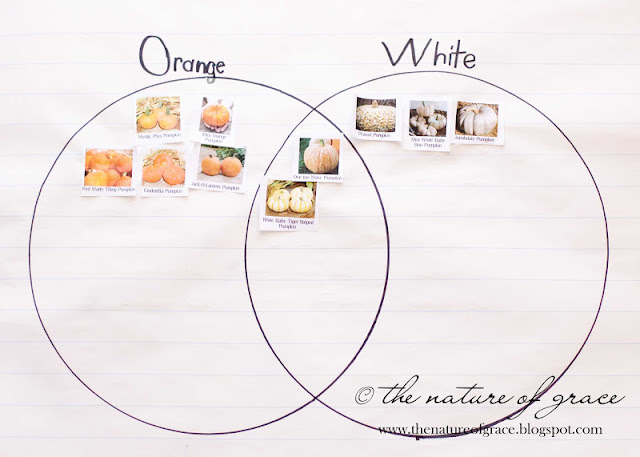 This was a Venn diagram we made. It would have been neat to use real pumpkins but that could have become expensive so we used pictures instead. We compared colors - orange, white(ish), and a mix. :)