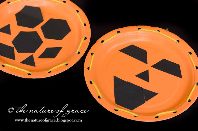 This was a cute lacing idea I found here. I decided to trace some pattern blocks onto black paper and let my kiddos practice making different funny faces on their jack-o-lantern plate. Then they made a final choice and glued it down!