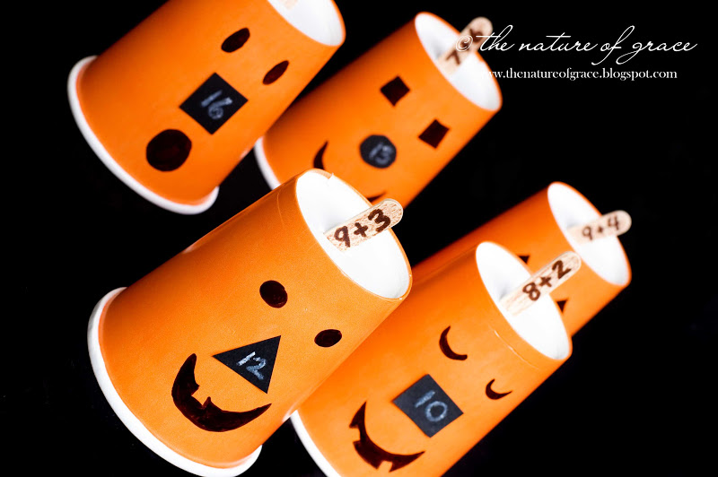 Jack-o-lantern math! I decided these orange cups needed a face AND a stem! I wrote number sentences on popsicle sticks (and colored the ends of the sticks a light brown). The number sentences equal the number on the jack-o-lantern nose. Then it was up to Miss A to match the number sentence "stem" to the correct jack-o-lantern (popsicle stick "stems" are inserted through a slit I cut in the bottom of the cups)!