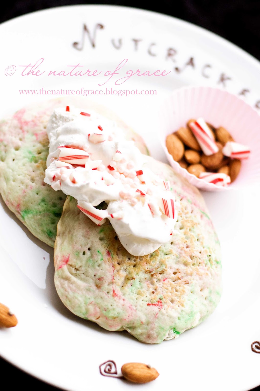 I used a pancake mix and swirled in some red and green food color (although the red color looked more pink which was fine because it still fit a nutcracker theme). I let the pancakes cook extra long on one side, and then I flipped them quickly and let them sit there lightly toasting on the other side briefly (think seconds) so as not to obscure the festive color swirls. I added whipped cream and sprinkles and candy cane bits for a stack of pancakes that would make the gingerbread man himself stop in his tracks if he happened by. :)