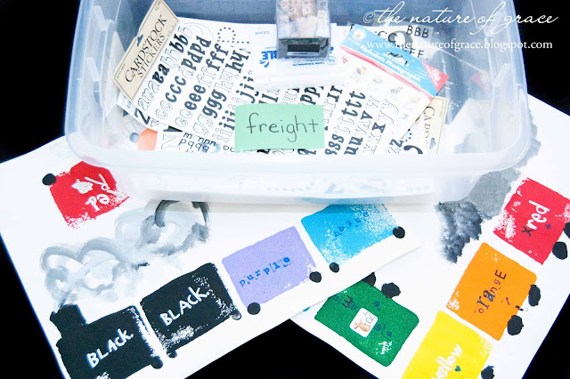 We read "Freight Train", and the kids made their own colored trains using small sponges for the cars (inspiration here). I then gave them a bin of "freight" to add to the cars. Each car carried the letters (freight) which matched its color.