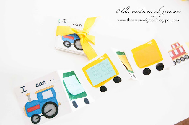 After reading "The Little Engine That Could", we completed this activity. I folded a sentence strip accordion style and glued the pictures of an engine and a caboose onto it (engine at the front and caboose at the back). I let the kids paint or draw train cars on each fold (my littlest didn't quite get his on the folds but still had fun).
