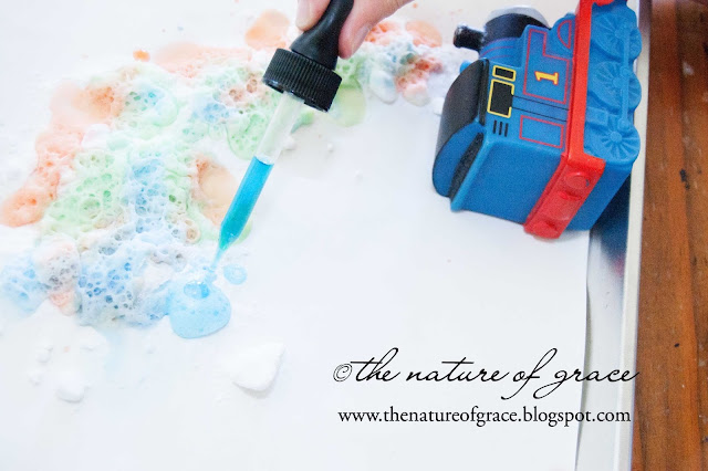What child doesn't enjoy playing with vinegar and baking soda? Inspired by what I saw in this post, I decided we would make some bubbly colorful "smoke" of our own.