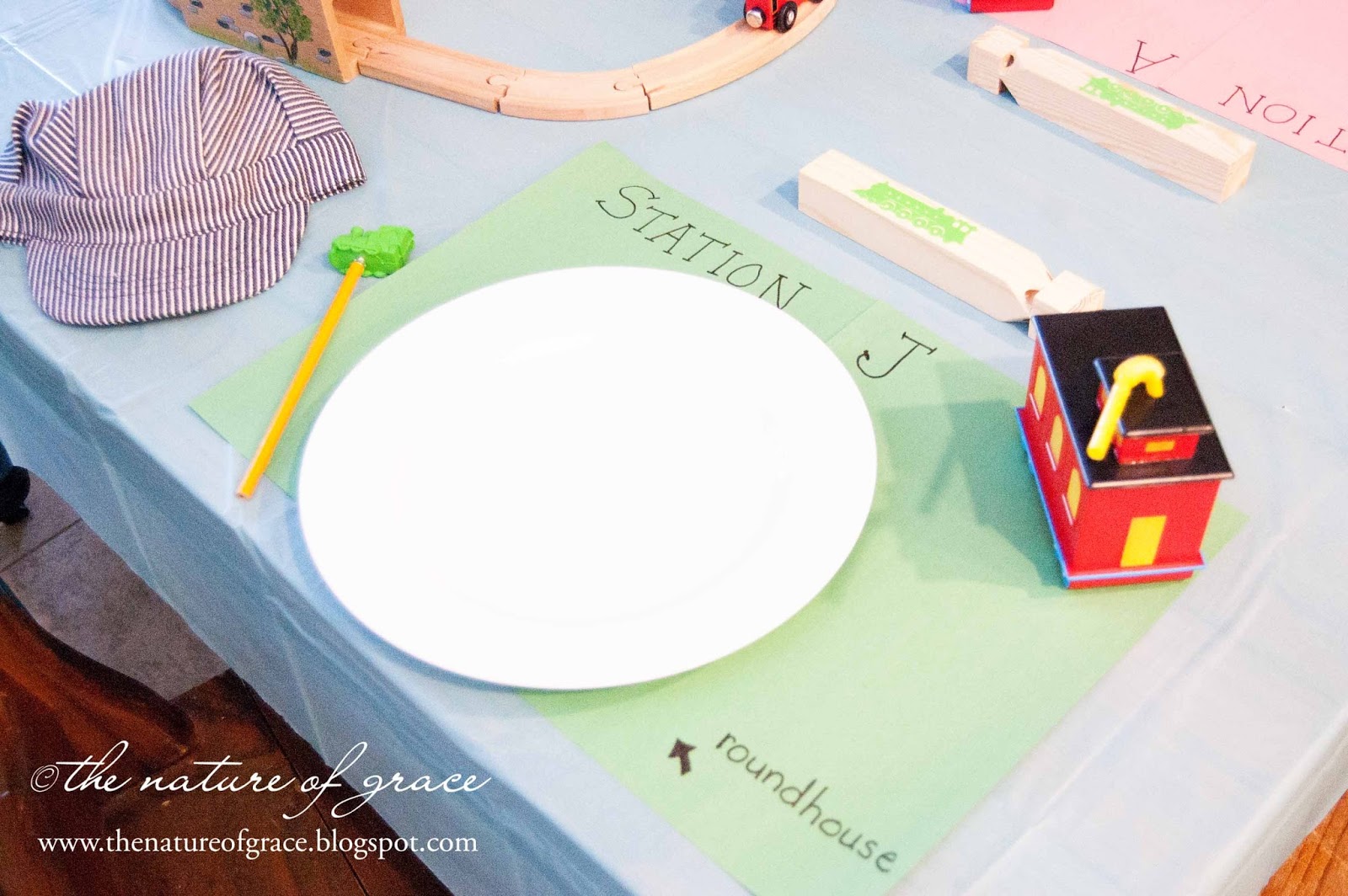 The mats are construction paper. I purchased the caboose cups, train pencil toppers, and engineer caps (yes, they even had PINK) through this website. The whistles came from the Dollar Store (Tree?).