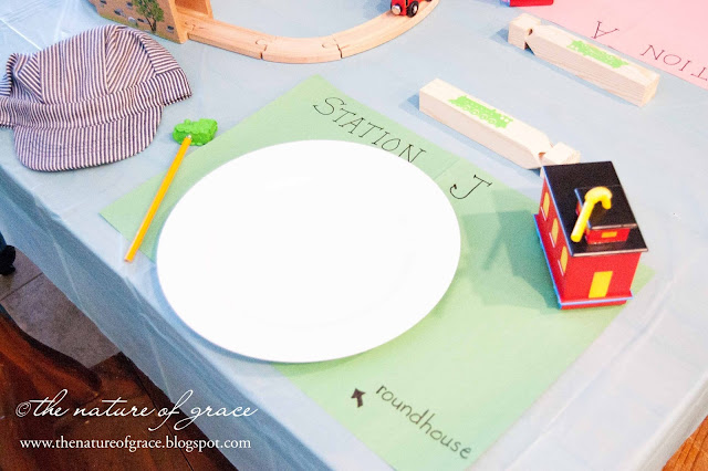 Breakfast set-up in the "Dining Car". I was very excited to find a battery operated engine that fit with the train set we already had, so I was able to surprise the kids with a train that actually moved around the tracks! :) I posted a link to one at the bottom of the post in case other moms out there have been searching for the same thing.