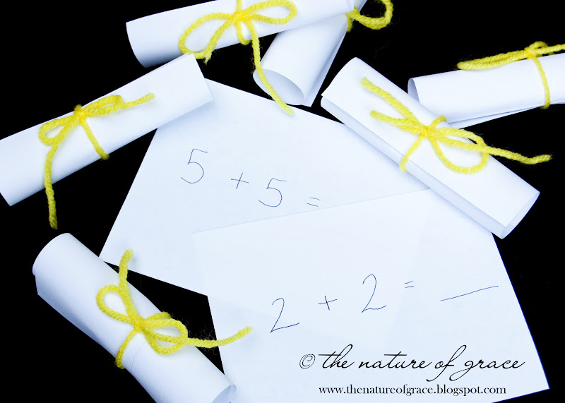 For some math practice, I wrote addition facts on little pieces of paper and rolled them up, tying each with string to make little diplomas.  Then Miss A opened and answered them.