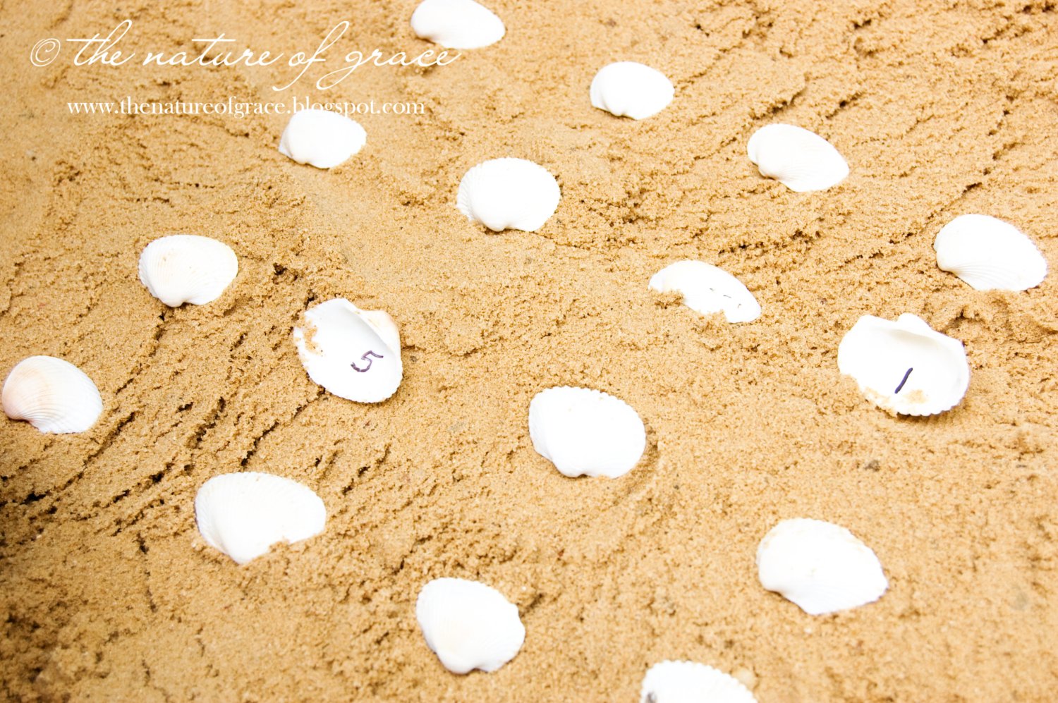 I saw a cute idea here on Pinterest regarding putting treasures under shells.  I put my own spin on it and wrote a number on the bottom of each shell to use for addition facts.  Miss A would turn over two shells, add the two numbers together, write the number sentence in the sand, and if she was correct - would get to keep the two shells.  Then I would have a turn.  At the end, we laid our shells out (matching one to one) in lines to see who had more.