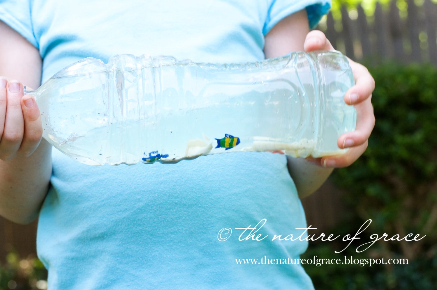 This is an activity called an "ocean in a bottle".  See here for directions on how to make your own.  We should have used more food coloring to make the water darker so you could see the division between the water and oil and benefit from a better visual of wave action.  Oh well.  Miss A still liked making this.  We added shells and fish buttons and some sand to ours.