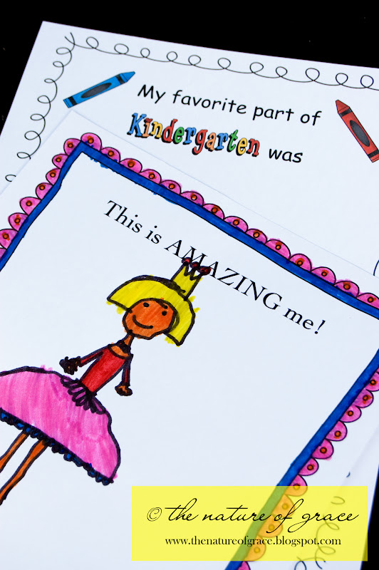 The book includes a cover, two pages of kindergarten facts (favorite color, teacher's name, favorite snack, favorite trip, etc.), my favorite part of kindergarten page, I learned...page, AMAZING me page (self portrait), a handprint page with a delightful poem, a special helper page with another cute poem (showcasing people who helped Miss A achieve success this year), and a page for autographs and well wishes/special messages!