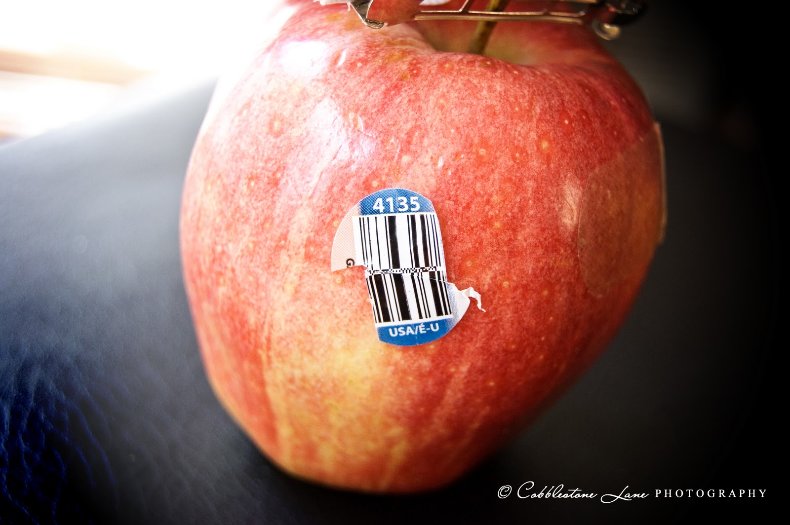 My, she is such a curious fruit!  Why just this afternoon we were showing her pictures of different kinds of apples and she wondered what type of apple she might be.  Then we had a wonderful, amazing idea!  We told her that some apples in stores have stickers on them that say where they came from and what kind of apple they are.  Did she have a sticker?