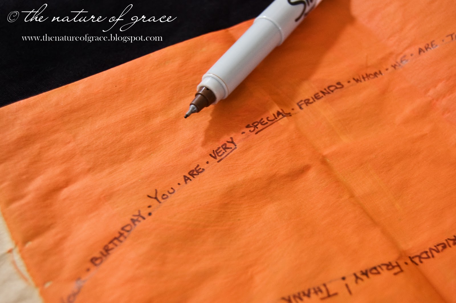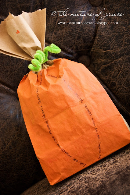 This was a fun accordian style book made from paper bags and snippets of items (I was inspired in part by this gorgeous blog: www.katherinemariephotography.com). Each page contains a descriptive sentence stating what the reader sees. The final page - the surprise - is that all of these items have come together to make a scarecrow (BTW - I believe all those black squiggly lines are crows flying away).