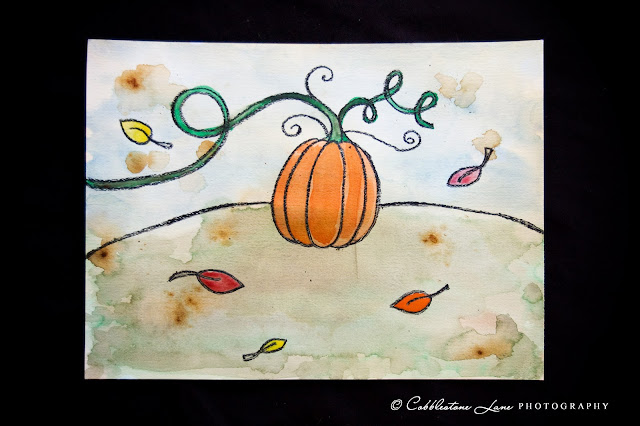 This was a watercolor painting my daughter made. We then did some texture rubbings of things and used the rubbings to cut out a small scarecrow, gluing him to her picture.